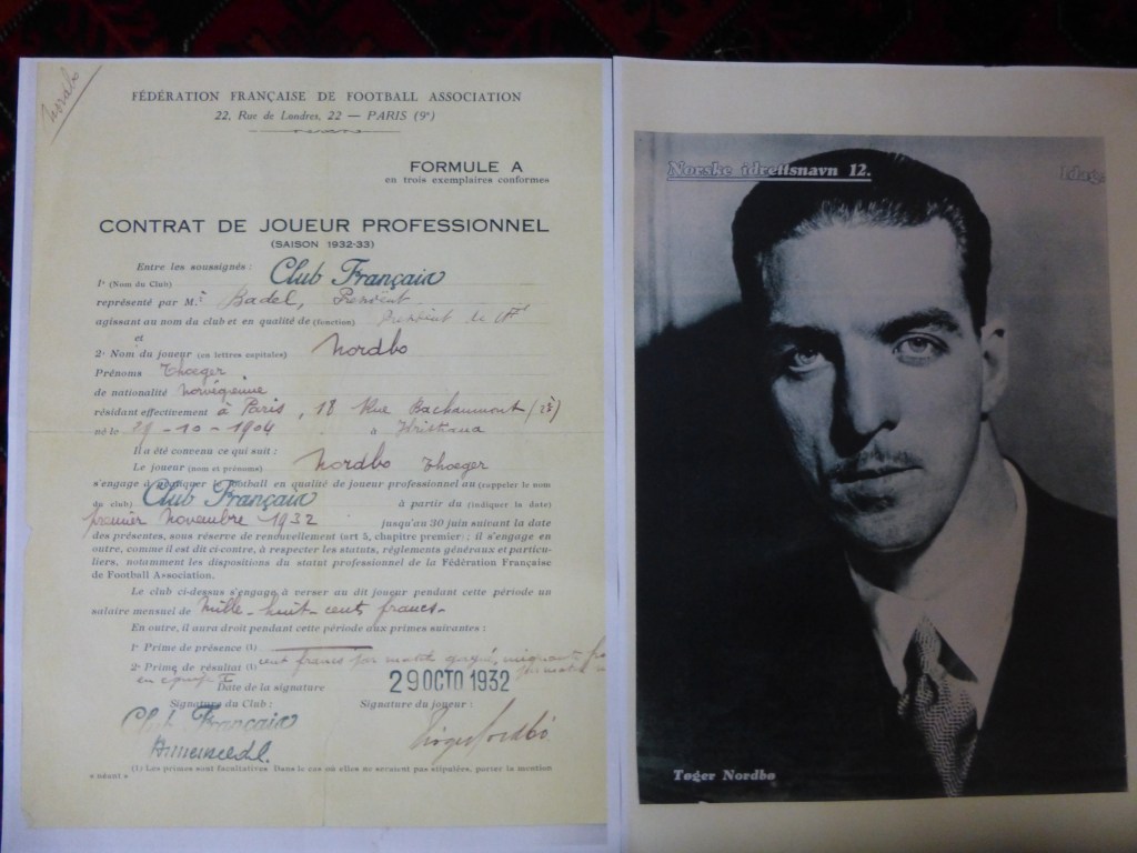 Profesjonaliseringen av fotballsporten innebar proffkontrakter og lønninger. Nordbø satte pennen til papiret, og ble med det den første nordmannen til å skrive proffkontrakt. Det fantes andre nordmenn som hadde spilt i europeiske klubber, og det forekom nok at penger gikk under bordet. Et eksempel er Einar «Jeja» Gundersen fra Skien, som spilte for franske FC Cette i 1921-22. Men Nordbø var altså den første offisielle proffen. Om betalingen sa Nordbø følgende: